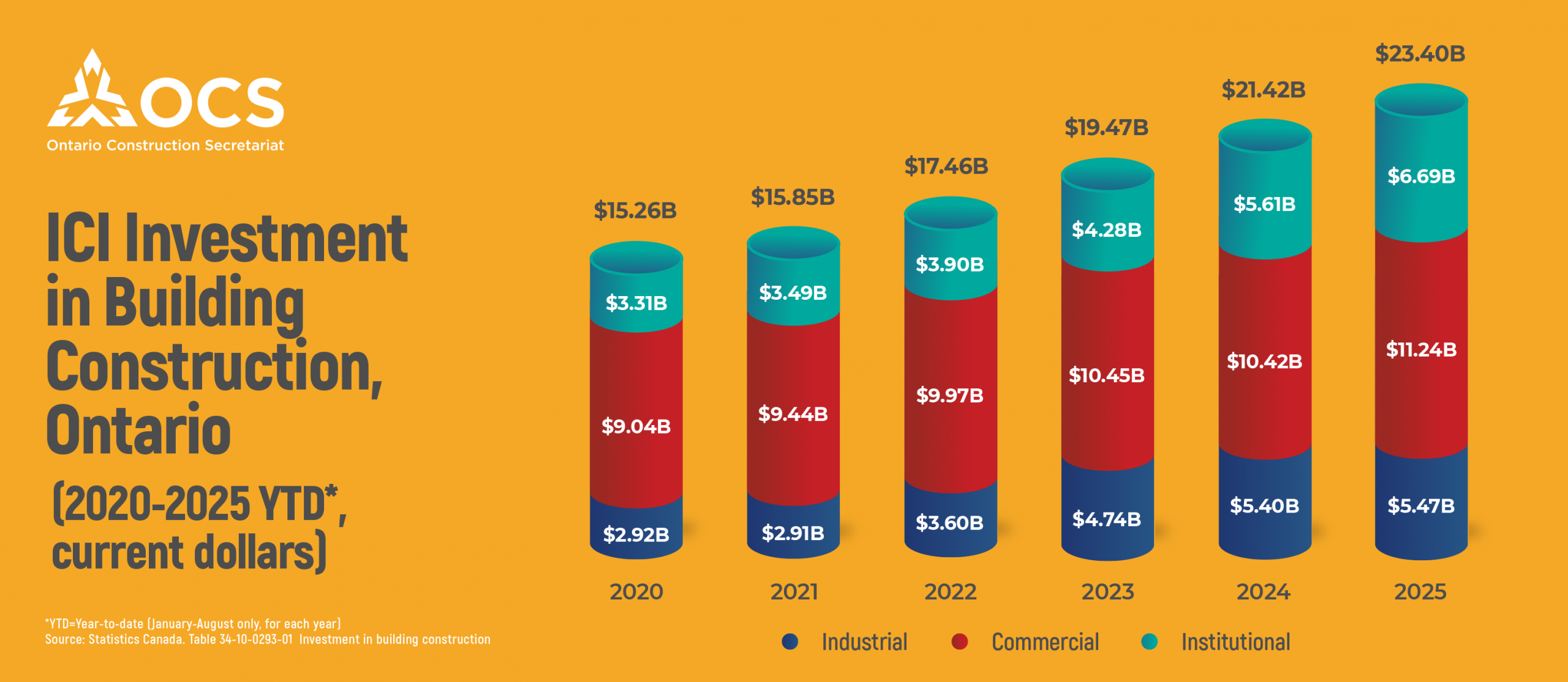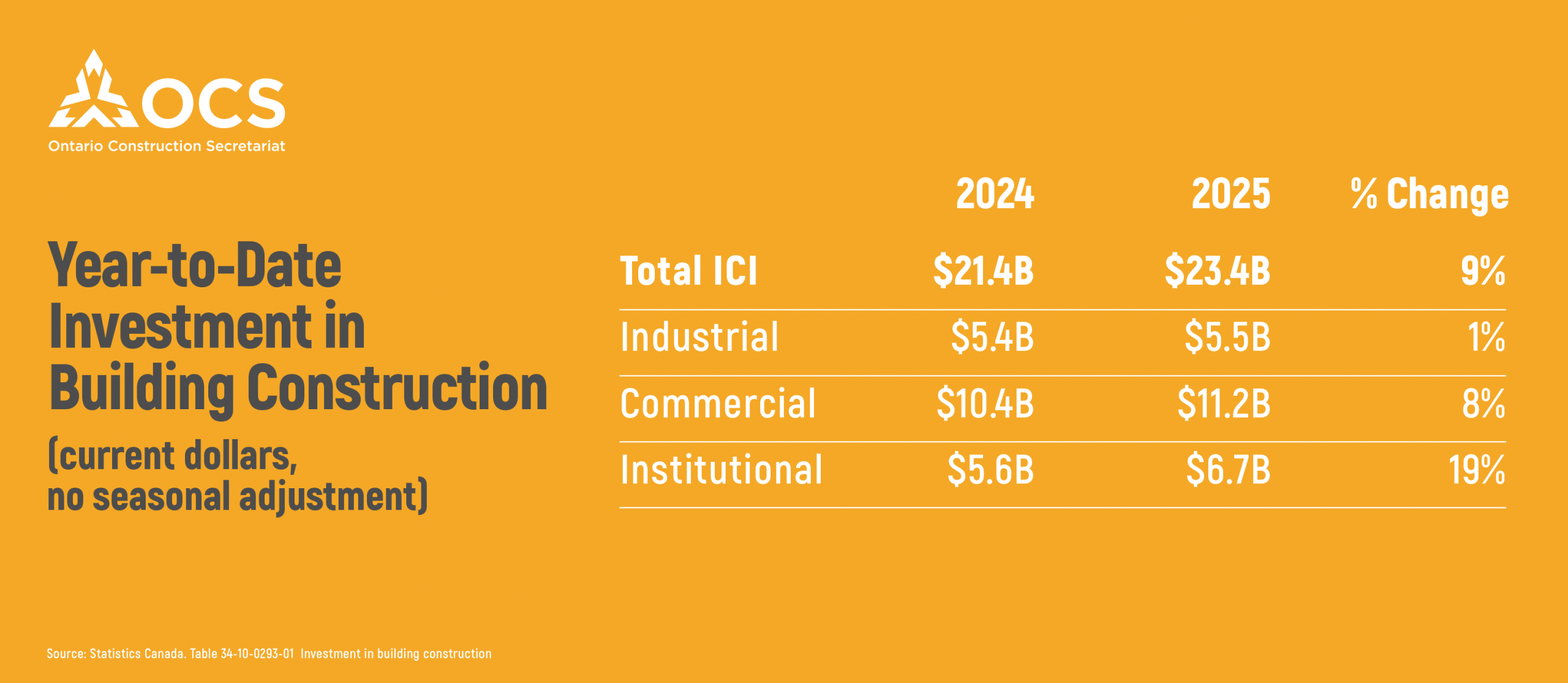 Total ICI building investment increased 9% YTD compared to 2024. The institutional sector in particular stood out with a 19% increase from $10.4B to $11.2B. The vast majority of this increase was concentrated in schools and education, which jumped from around $2B to almost $2.8B. Commercial investment came in at a solid 8%, while industrial investment nudged up 1%.