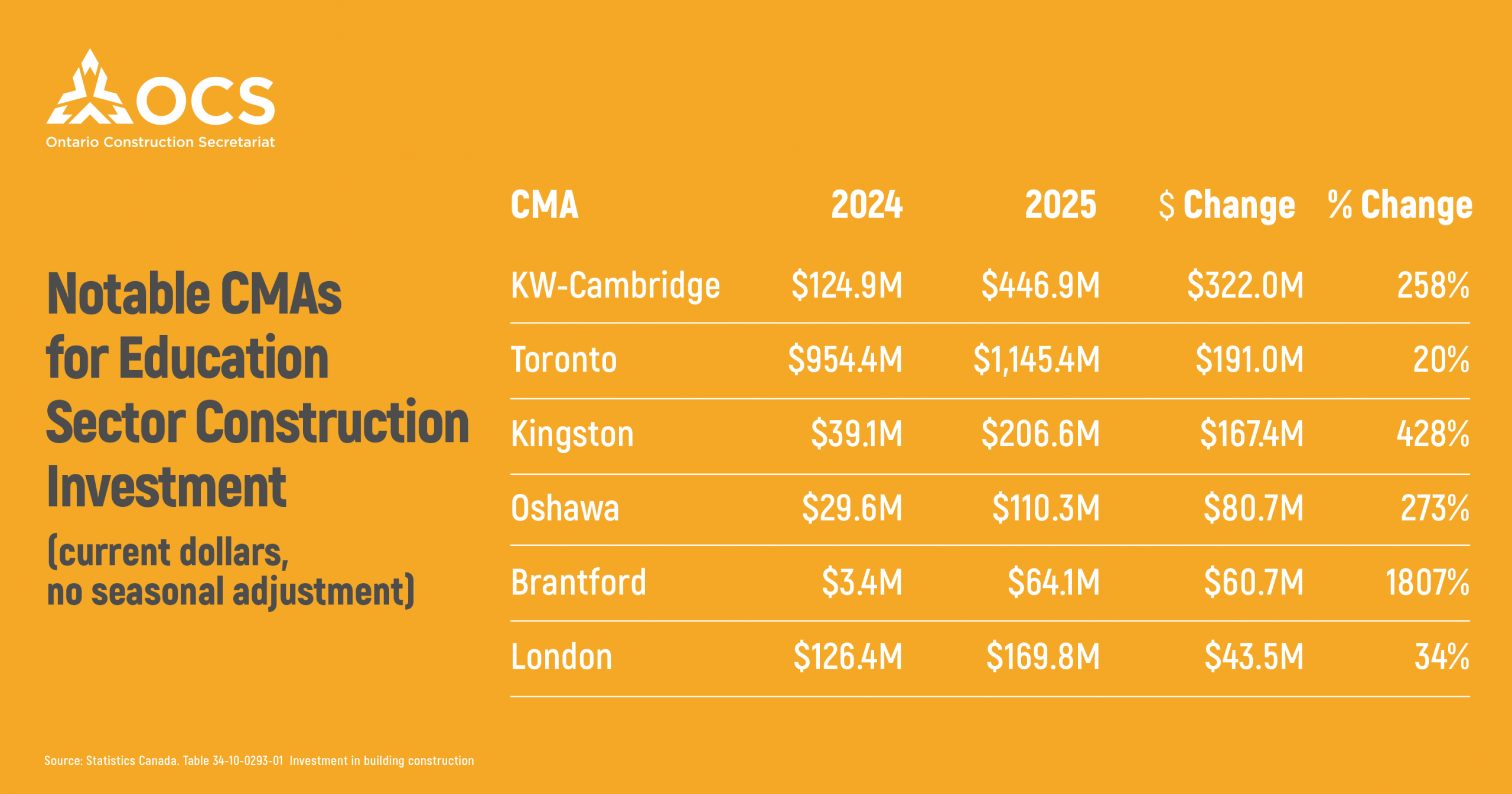 Kingston, KW-Cambridge, and London had the most significant building investment increases. Kingston and KW’s largest percentage increase were found in schools and education (see chart above). Building investment was elevated throughout 2025, owing to various elementary school construction projects in both regions, as well as college and university upgrades in KW. As noted in the chart, London also saw a sizable increase in schools and education. However, the greatest increase was in the plants and factories segment, which was up over threefold from $133.4M to $475.2M. This is likely, in part, due to continuing work on the St. Thomas Battery Plant.