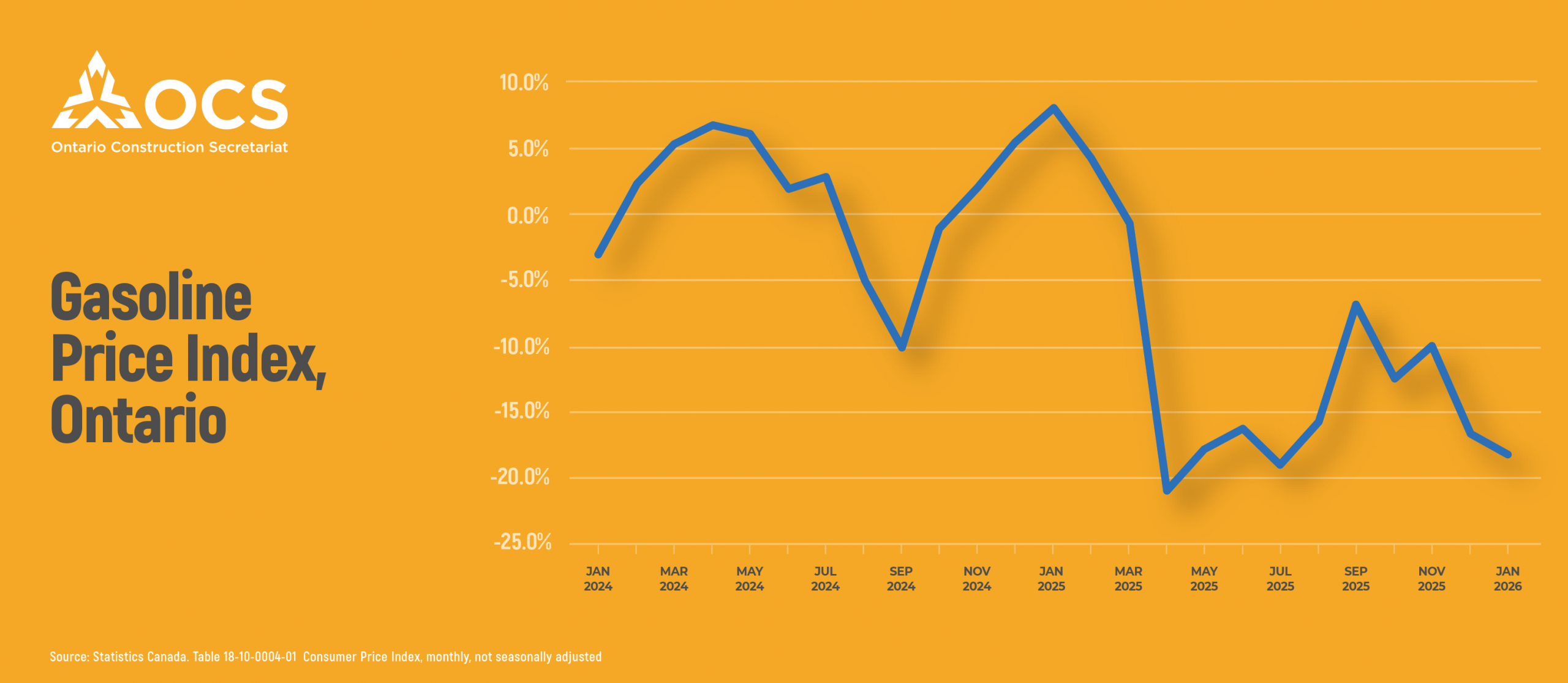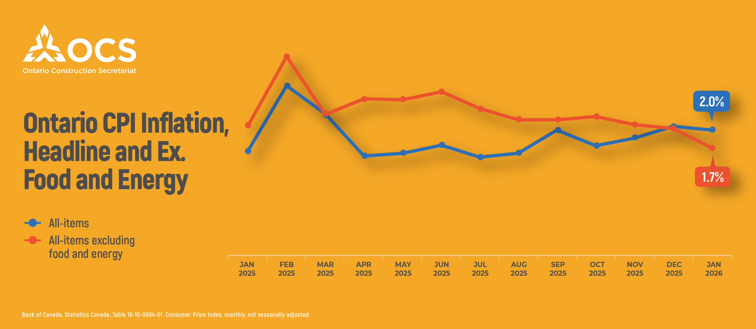 According to the latest Consumer Price Index (CPI) data, inflation in Ontario stood at 2.03% year over year in January 2026, a slight easing from 2.09% in December 2025. On a monthly basis, prices declined by 0.12% in January, following a 0.30% decrease in December.