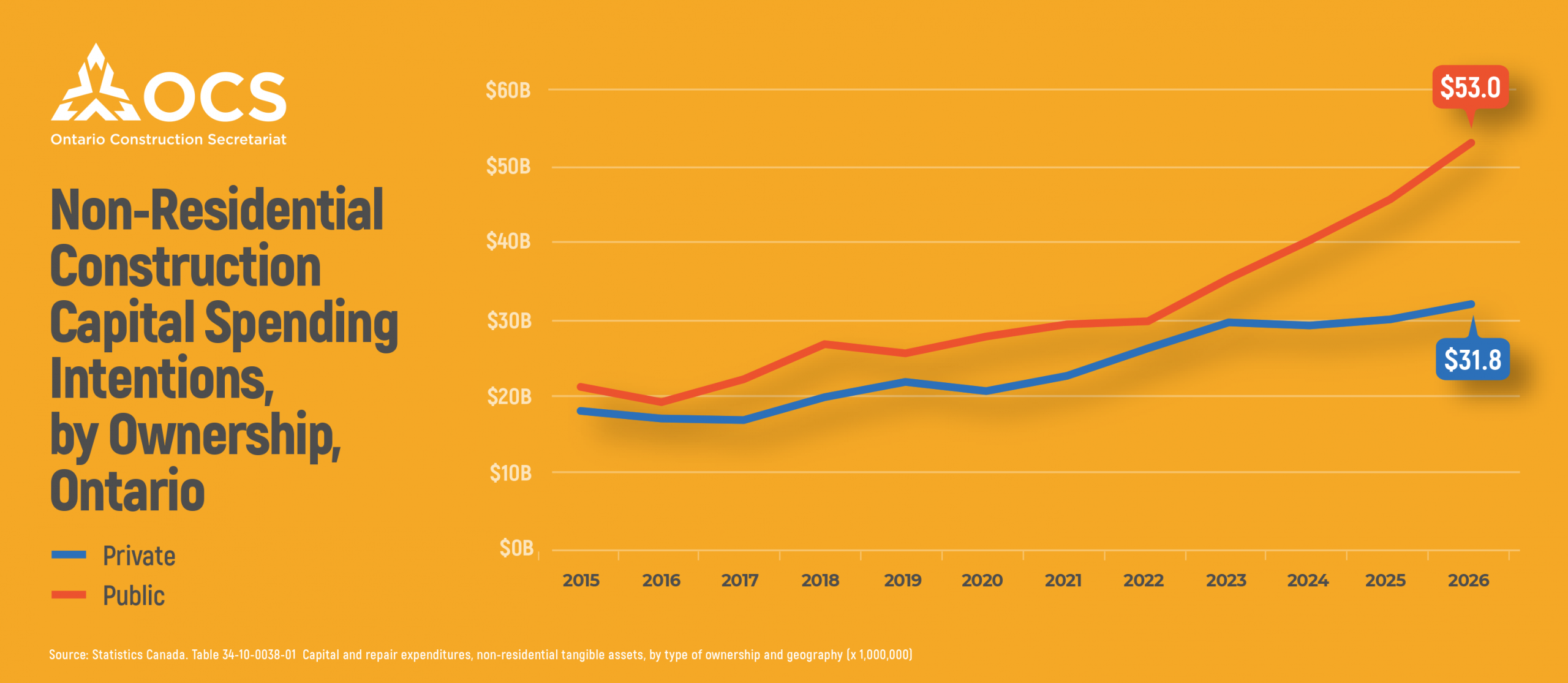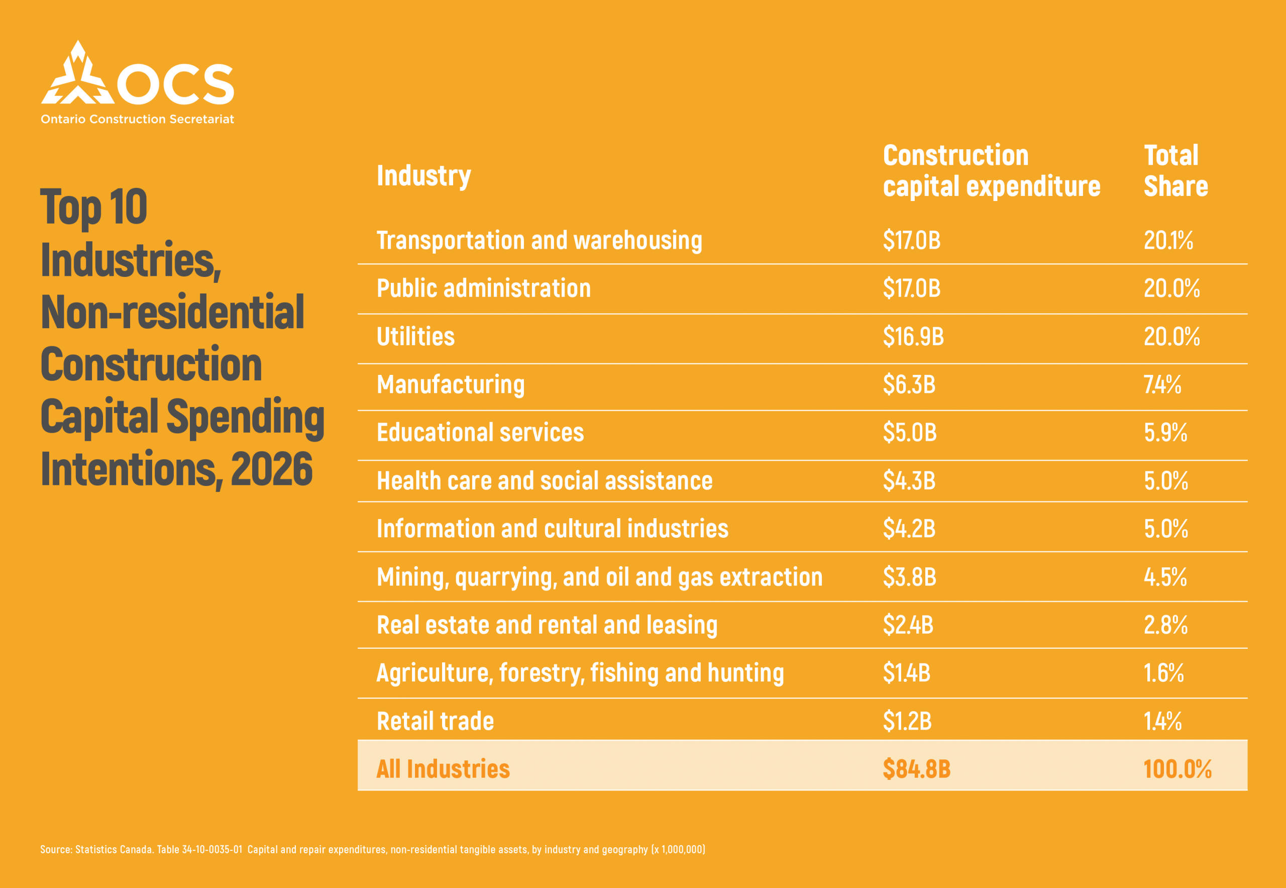 Capital spending intentions for non-residential construction in Ontario are expected to rise by 12.2% in 2026 to $84.8 billion. The increase is largely driven by the public sector.