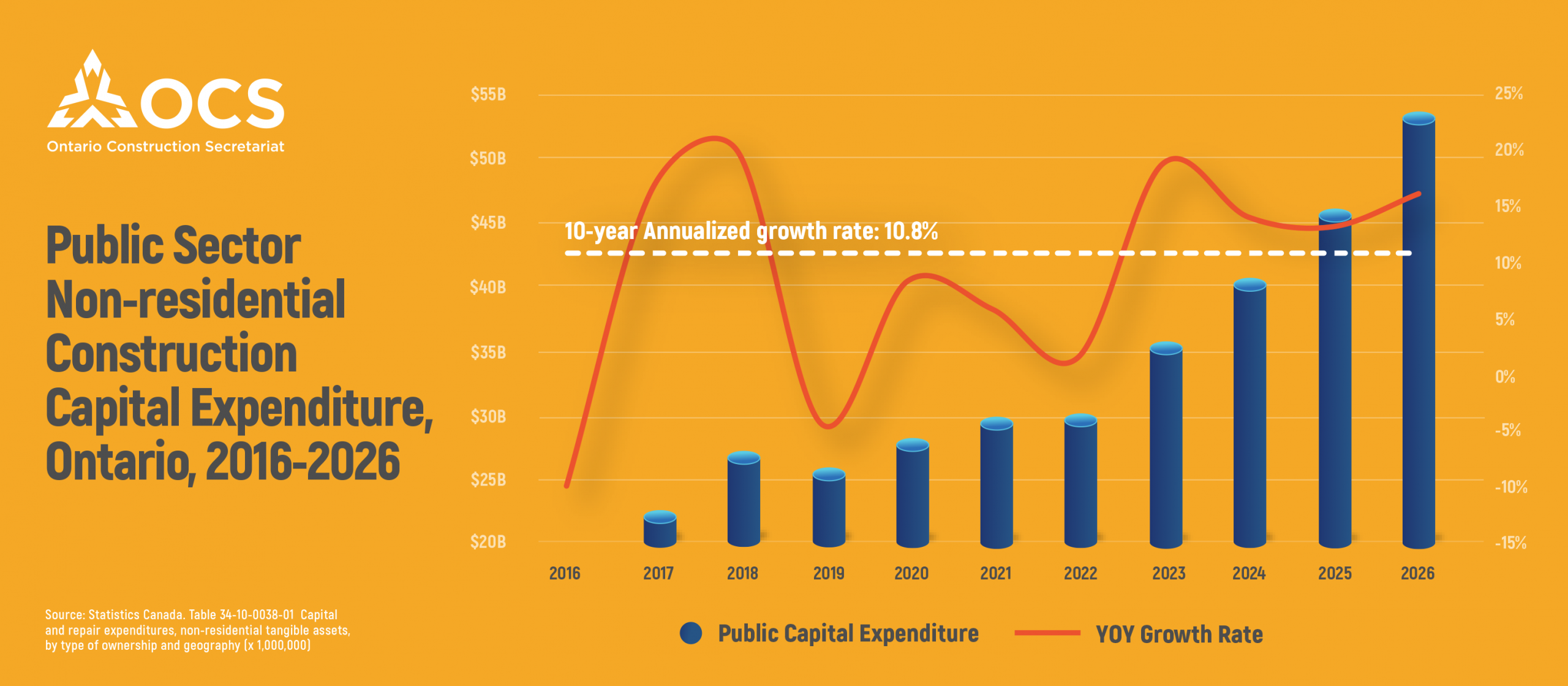 The public sector accounts for 62% of total capital spending intentions in 2026. Public capital expenditure has been on a strong upward trend, with recent annual growth rates exceeding the 10-year average growth rate of 10.8%. Current double-digit growth of 16.2% suggests a strong project pipeline and continued government support for infrastructure development.