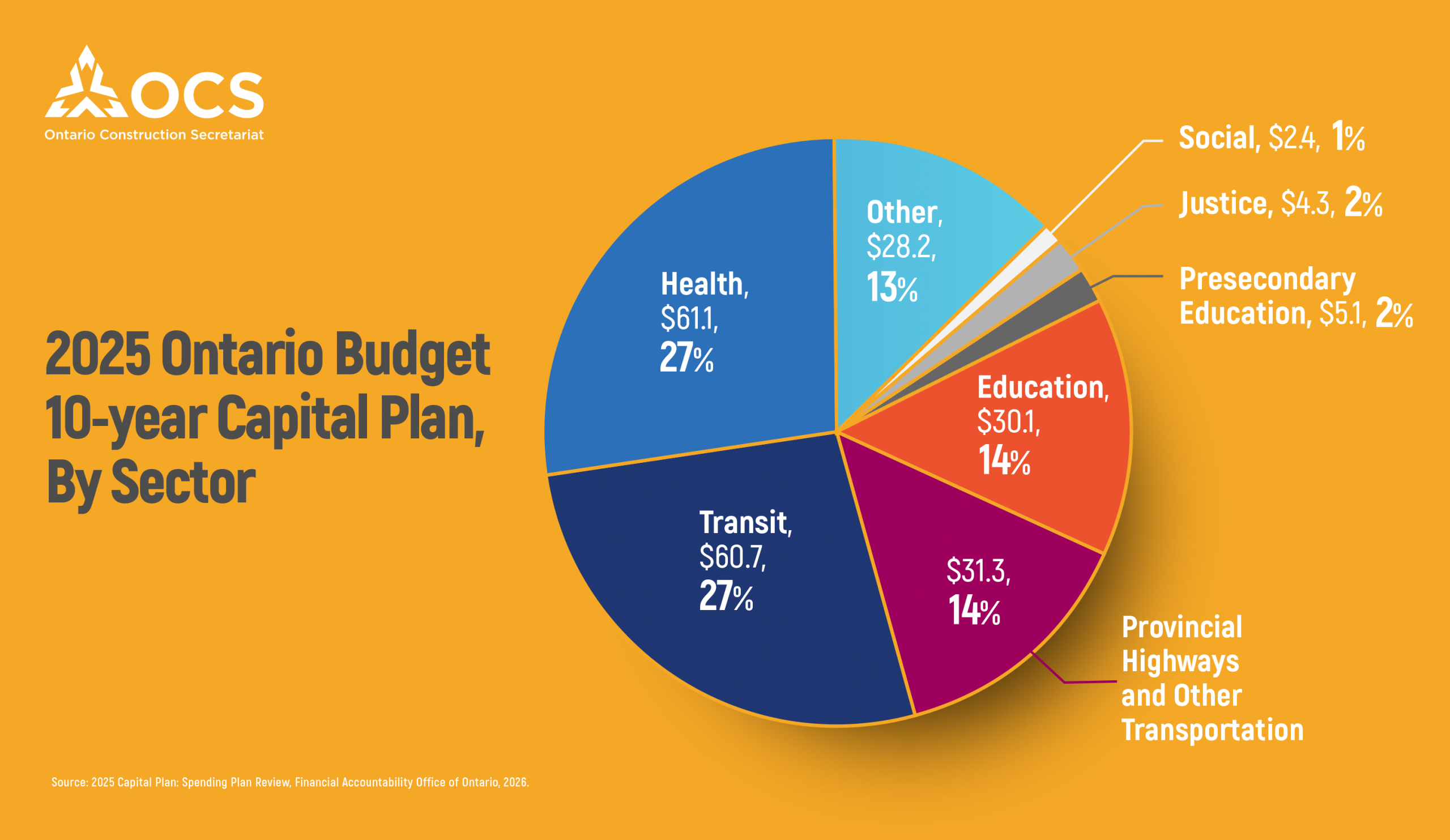 Sectorally, health (27%) and transit (27%) account for the largest shares of total investment, followed by highways and transportation (14%), education (13%), and other infrastructure (13%), with smaller shares in postsecondary education, justice and social infrastructure.