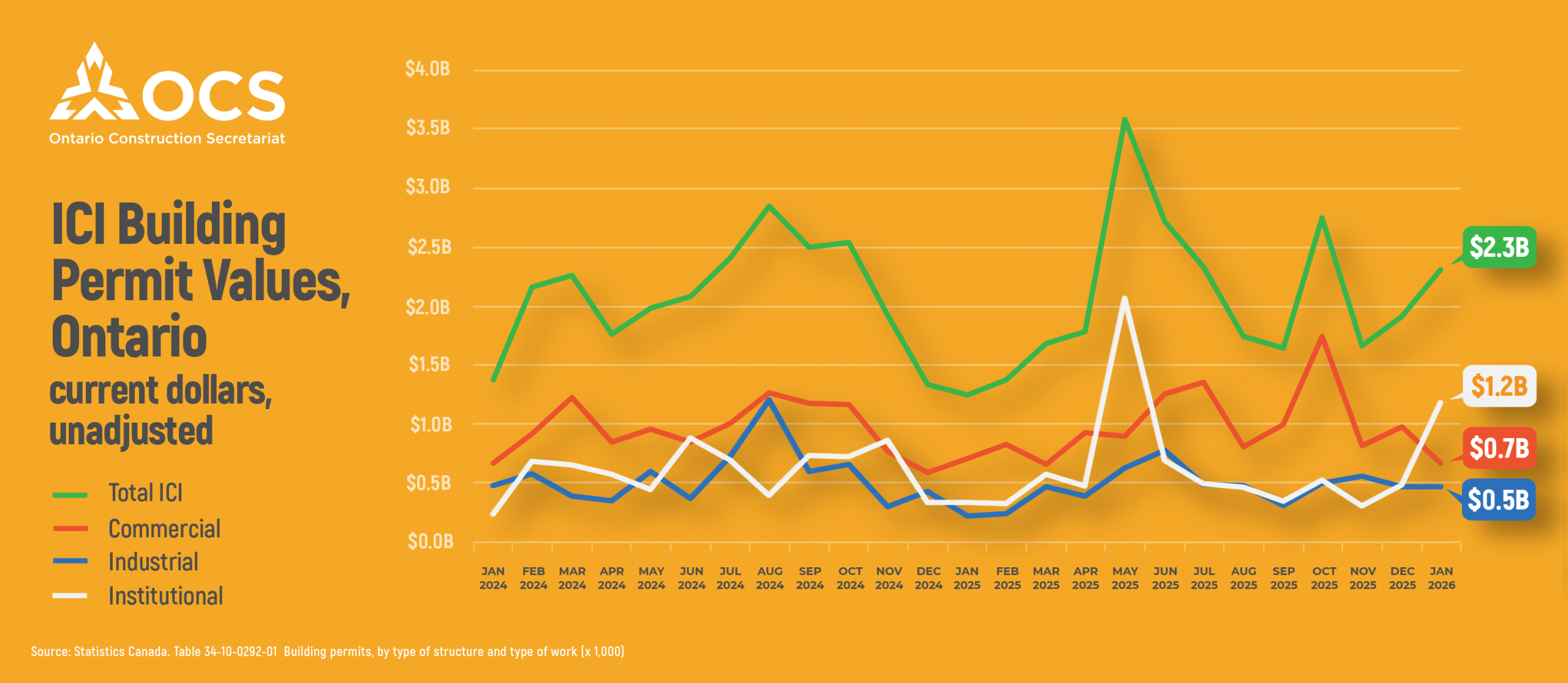 Ontario recorded $2.31 billion in industrial, commercial and institutional (ICI) building permits in January 2026, up 20.8% from December. The increase was largely driven by strong institutional activity, especially major medical projects in Toronto. While industrial permits remained stable, commercial permits declined compared with the previous month.