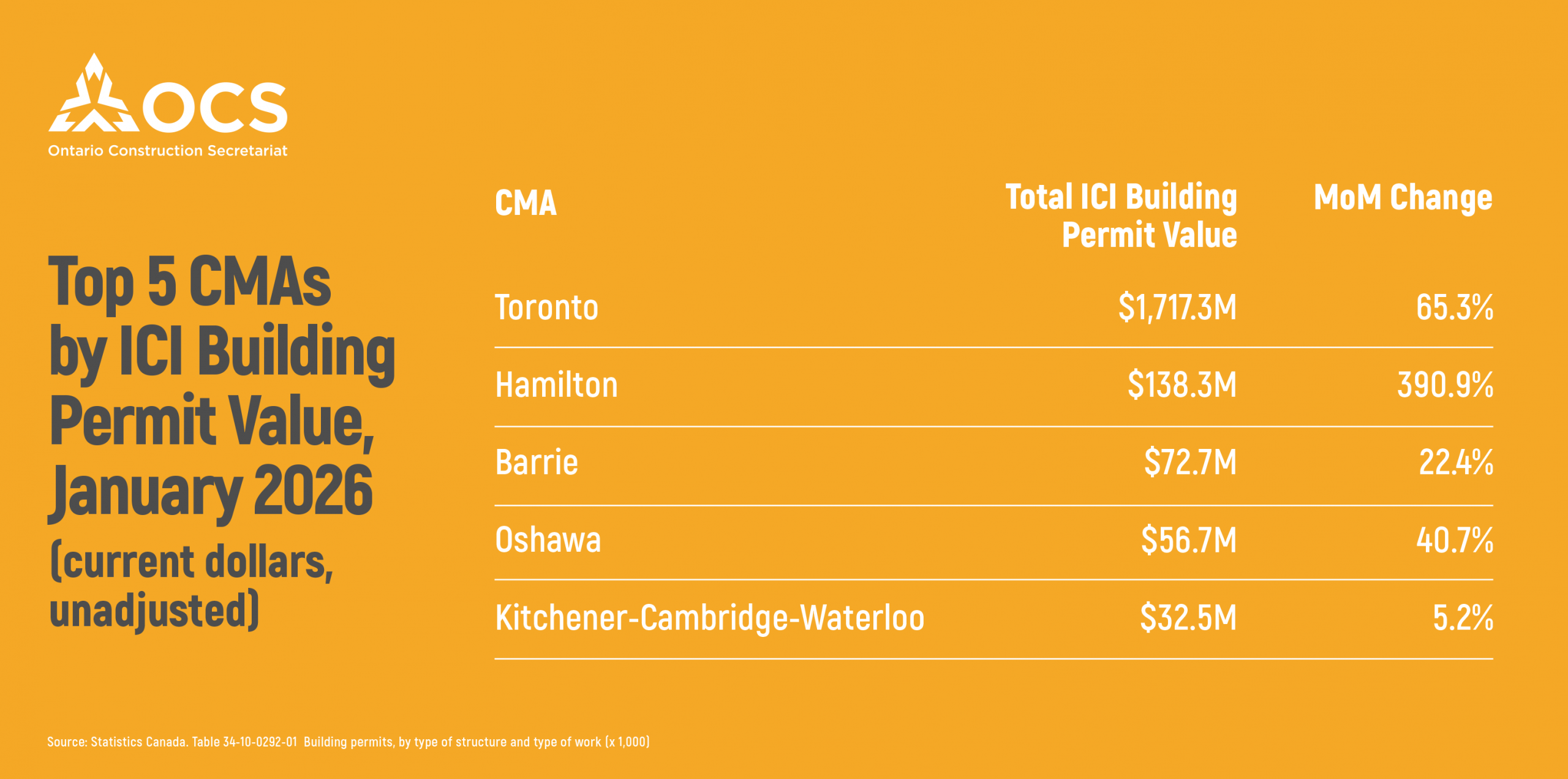 Total industrial, commercial and institutional building permits in Ontario reached $2.31 billion in January 2026, marking a strong start to the year. Permit values were 20.8% higher than in December 2025.